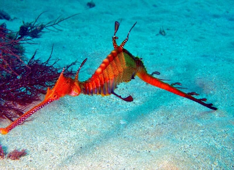 Ближайшим родственником это рыбы является морской конек. Этот вид был открыт недавно, в 2015 году. Именно тогда возле берегов Австралии специалисты обнаружили рубинового морского дракончика. Свое название существо получило за яркую окраску. К сожалению, практически ничего не известно про эту рыбу. Мы знаем только, что она обитает на большой глубине, где красный цвет служит ей прекрасной формой защиты – маскировкой.