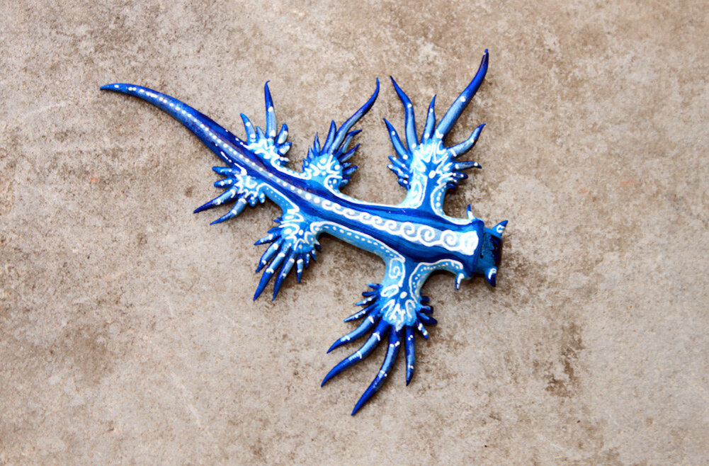 Или голубой ангел, или глаукус атлантический. Это вид брюхоногих моллюсков, обитающих в Мировом океане. Чаще всего он попадается на побережьях Австралии, Африки и США. Голубой дракон не летает, он «ползает» по водной поверхности, подгоняемый ветром. Яркая внешность служит прекрасной маскировкой этому моллюску. Голубая спинка скрывает его от птиц сверху, маскируя под воду, а белое или серебристо-серое брюшко прячет от рыб снизу. Несмотря на свой безобидный внешний вид голубой дракон опасен. Кожа моллюска покрыта ядом, поэтому крайне не рекомендуется брать его голыми руками.