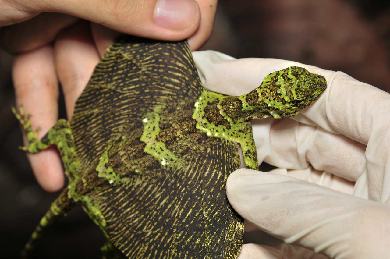 В сказках все драконы умеют летать, и этот дракон, обитающий в тропических лесах Юго-Восточной Азии, не является исключением. Благодаря широким кожным складкам по бокам тела он может планировать на расстояние свыше 20 метров. У самцов на горле находится мешковидная кожная складка, выдвигающаяся вперед, — при планирующем полете она служит стабилизатором. Чешуя туловища и хвоста летучего дракона «раскрашена» под цвет коры дерева. А «крылья», наоборот, имеют очень яркие цвета.