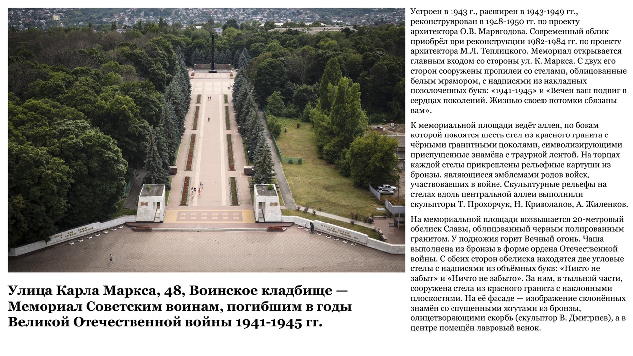 Улица Карла Маркса, 48. Воинское кладбище – Мемориал советским воинам, погибшим в годы Великой Отечественной войны 1941-1945 гг. Устроен в 1943 году, расширен в 1943-1949-х, реконструирован в 1948-1950 годы по проекту архитектора О.В. Маригодова. Современный облик приобрел при реконструкции в 1982-1984-е по проекту архитектора Марка Теплицкого. Мемориал открывается главным входом со стороны улицы Карла Маркса. С двух его сторон сооружены пропилеи со стелами, облицованные белым мрамором, с надписями из накладных позолоченных букв: «1941-1945» и «Вечен ваш подвиг в сердцах поколений. Жизнью своею потомки обязаны вам».
