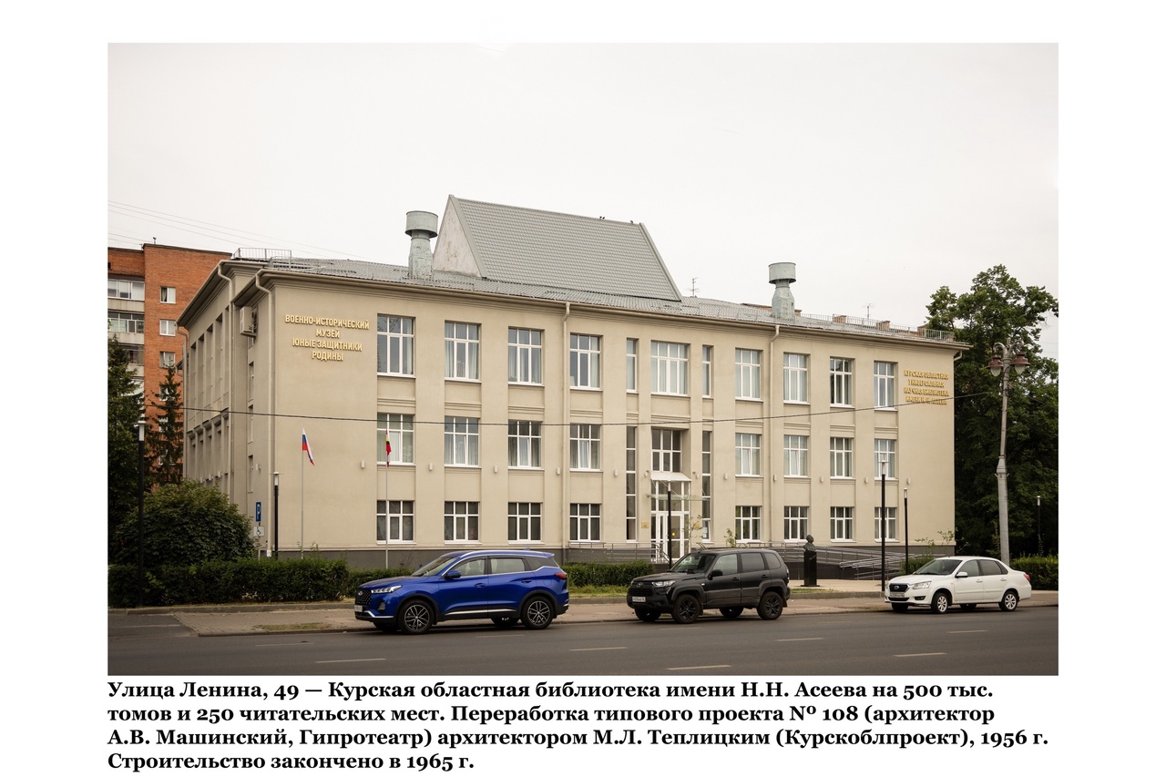 Улица Ленина, 49. Курская областная библиотека имени Н.Н. Асеева на 500 тысяч томов и 250 читательских мест. Переработка типового проекта №108 (архитектор А.В. Машинский, Гипротеатр) архитектором М.Л. Теплицким (Курскоблпроект), 1956 год. Строительство закончено в 1965-м 6