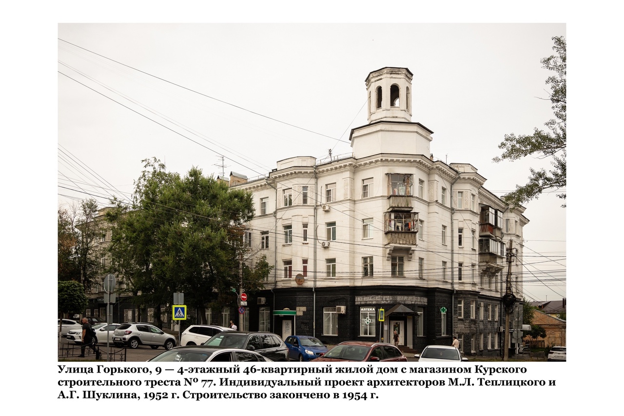 Улица Горького, 9. Четырехэтажный 46-квартирный жилой дом с магазином Курского строительного треста №77. Индивидуальный проект архитекторов М.Л. Теплицкого и А.Г. Шуклина, 1952 год. Строительство закончено в 1954-м 6