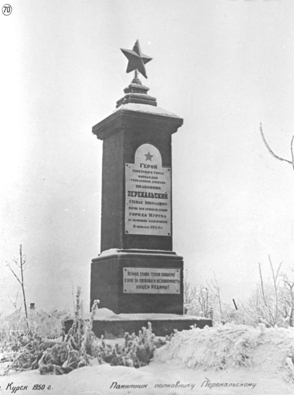 Но вернемся к похоронам. Возле могилы прошел митинг, который объединил почти 10 тысяч человек. Погребение состоялось со всеми военными почестями – 70 автоматчиков дали салют. 23 февраля 1943 года горисполком принял решение улицу Ямскую назвать именем Степана Николаевича Перекальского. Так и появилась площадь в самом сердце Курска, но, как мы понимаем, ее появление никак не связно с гибелью комдива в этом месте.
