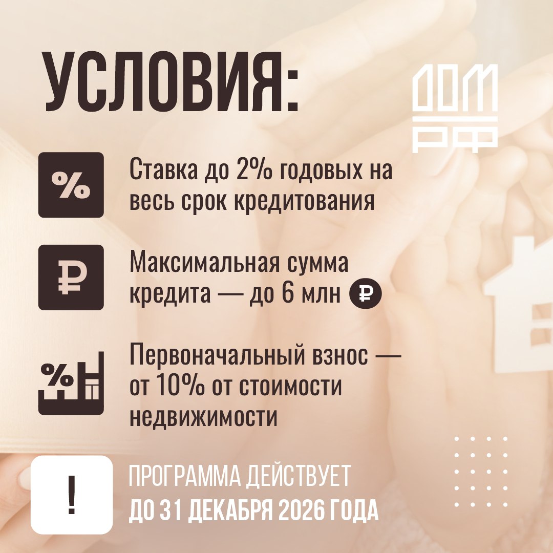 Максимальная сумма кредита составляет 6 млн рублей. Первоначальный взнос —от 10%. Программа действует до 31 декабря 2026 года.