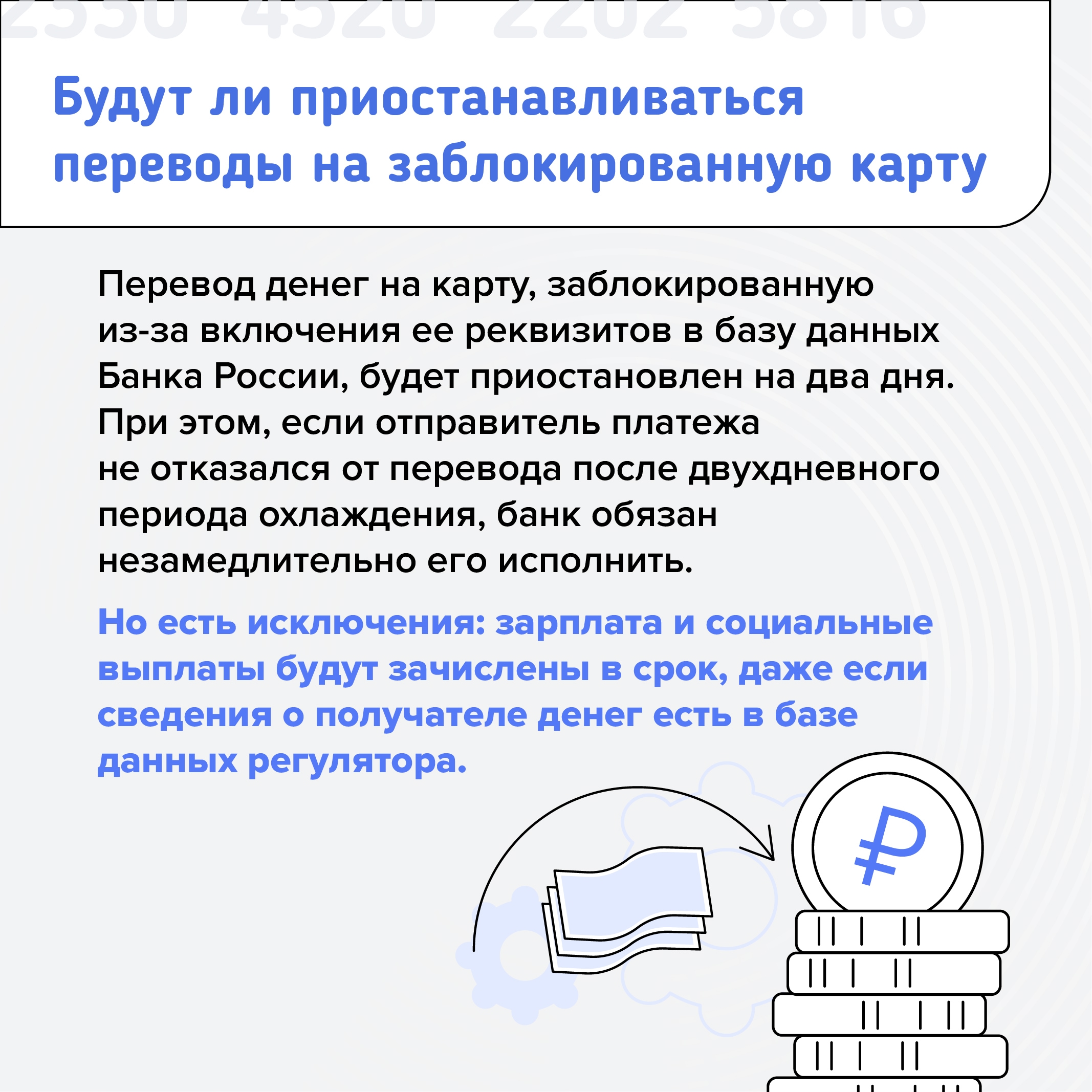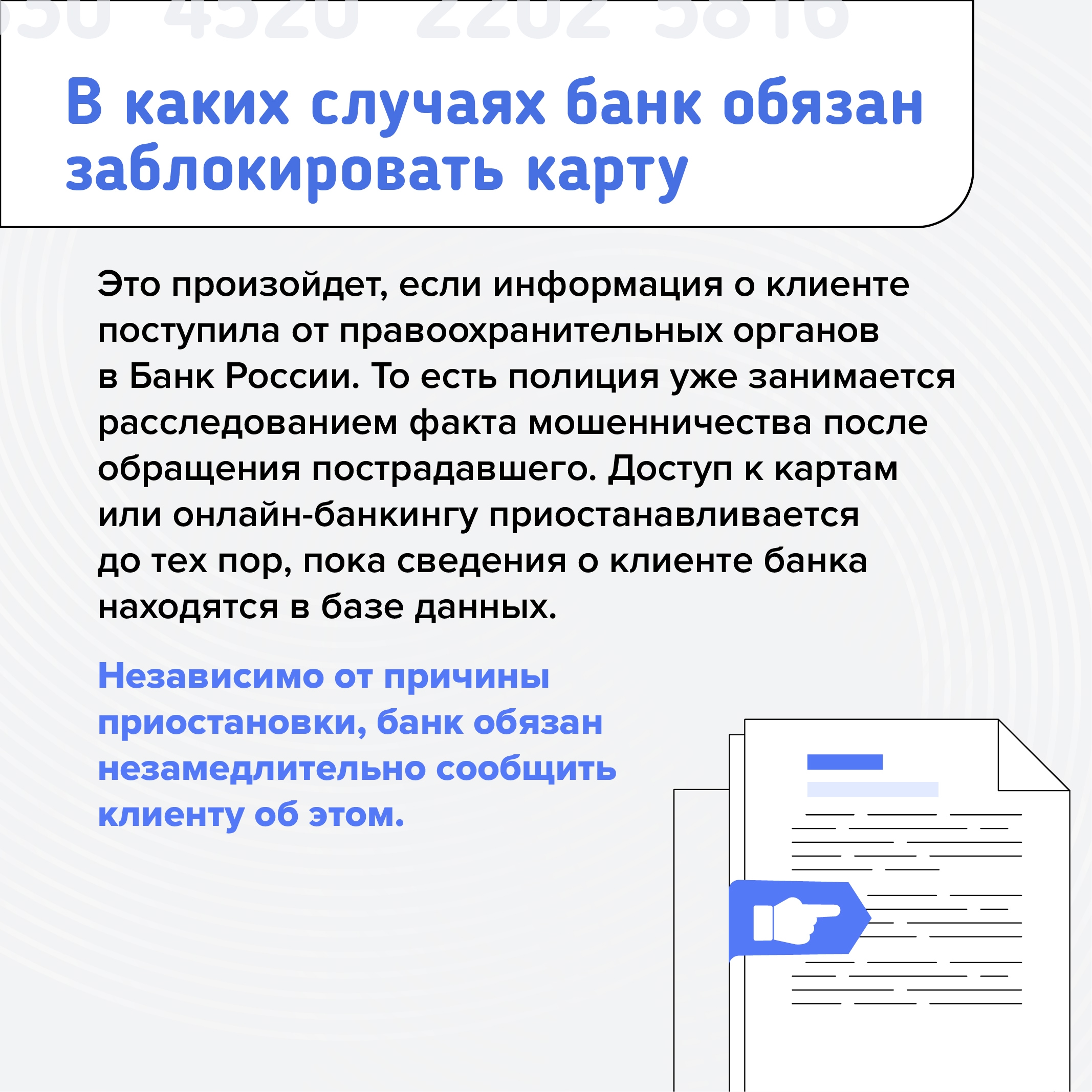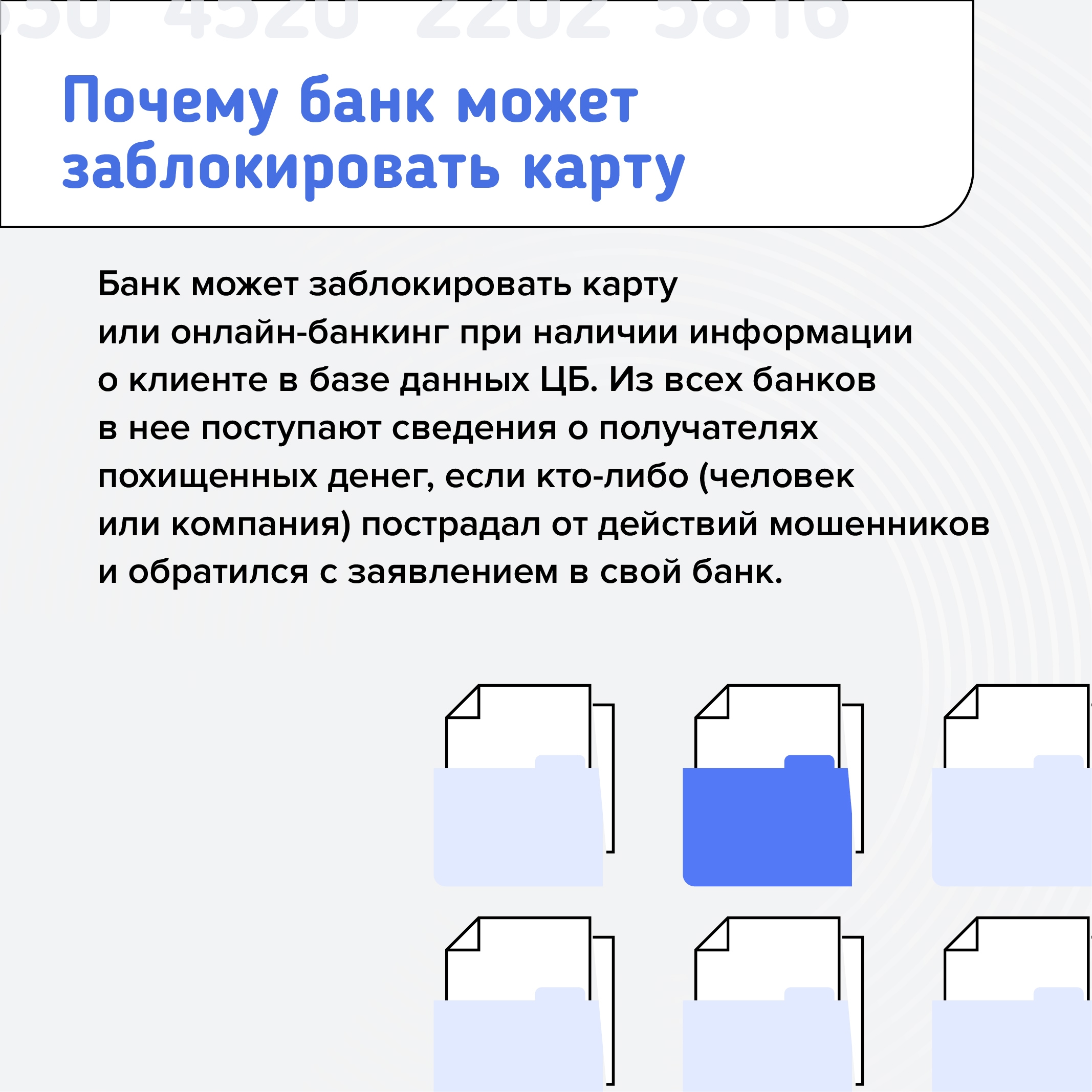 Для борьбы с мошенничеством банк может на время заблокировать карту или возможность перевода денег. Такое право дает 161-ФЗ РФ. Причины могут быть разными: это и проблемы, связанные с налогами, и попадание в базу дропов, и подозрения по «антиотмывочному» закону.