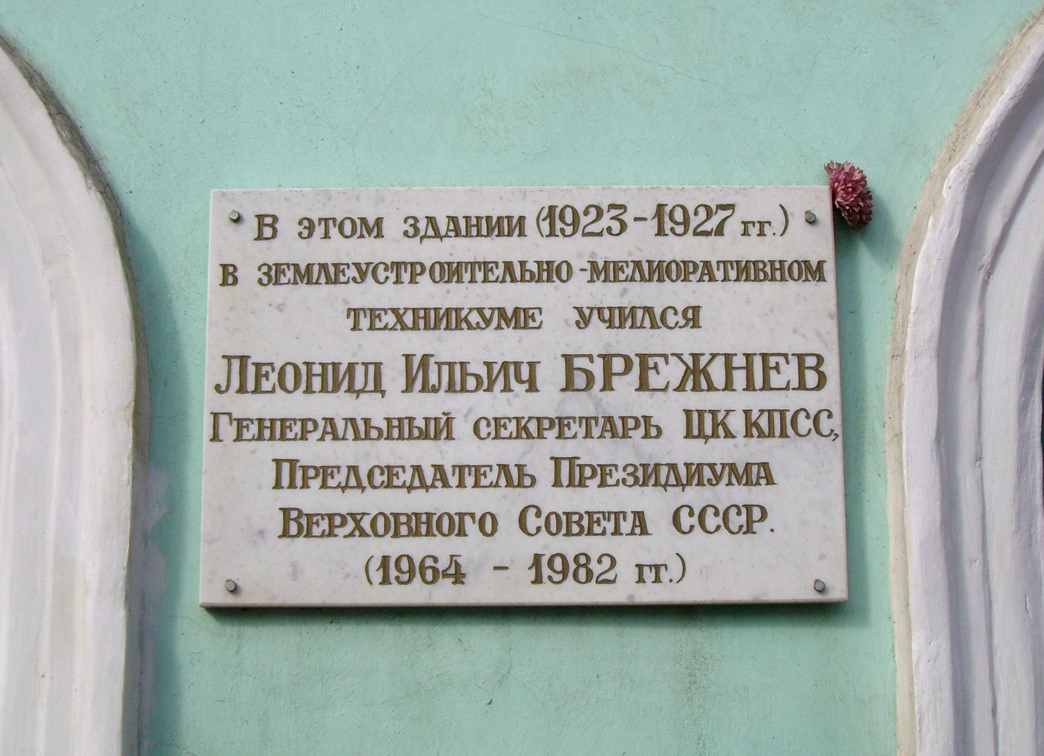 В 1986-м в Курске по адресу: улица Дзержинского, 49, на здании бывшего техникума, где обучался Брежнев, установили мраморную доску с «золотой» надписью «Здесь в 1923-1927 гг. учился Л.И. Брежнев – Генеральный секретарь ЦК КПСС и Председатель Президиума Верховного Совета СССР».